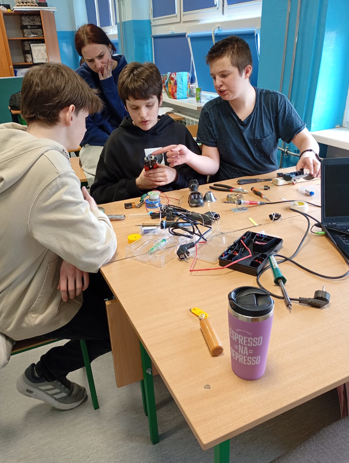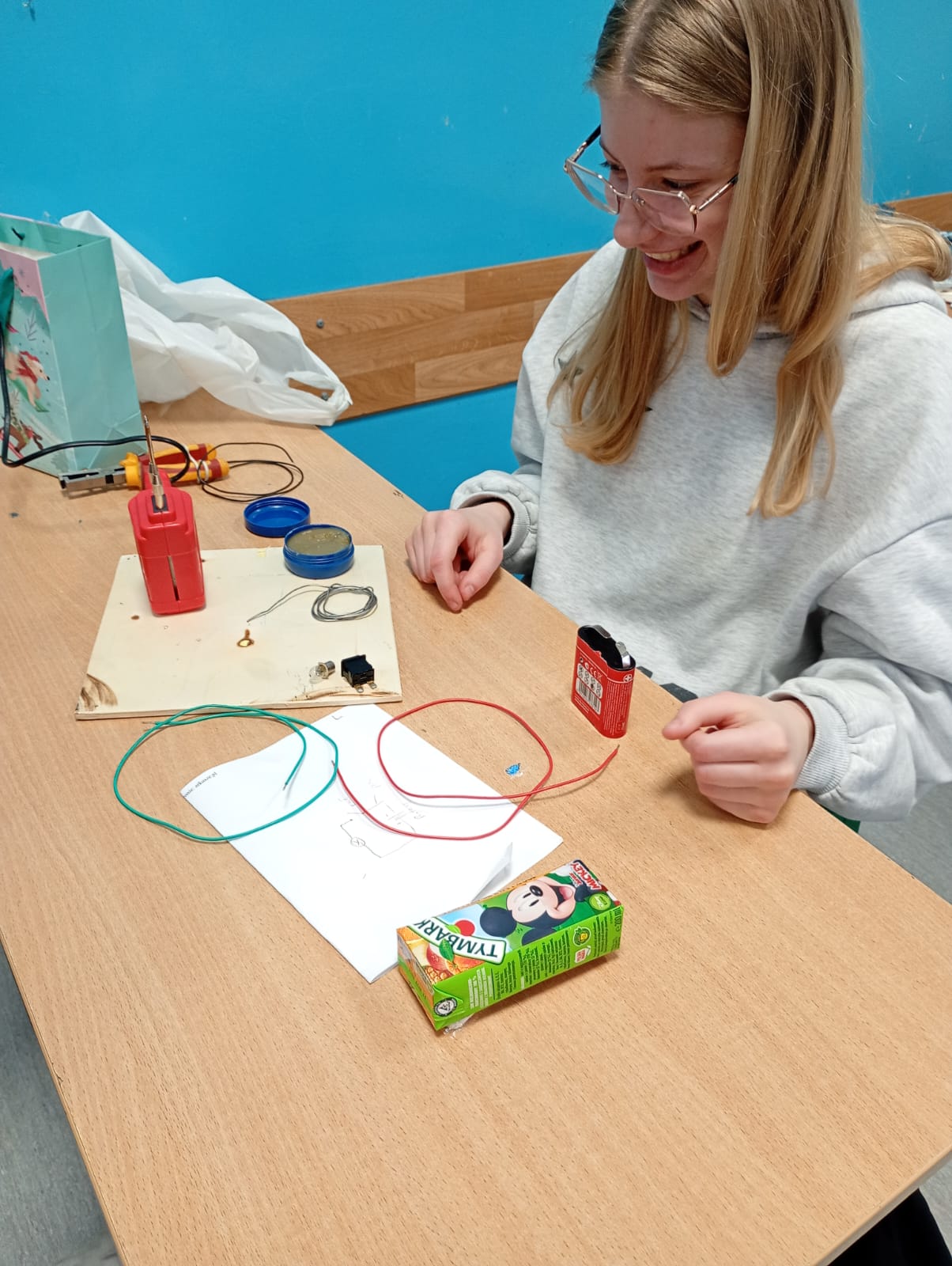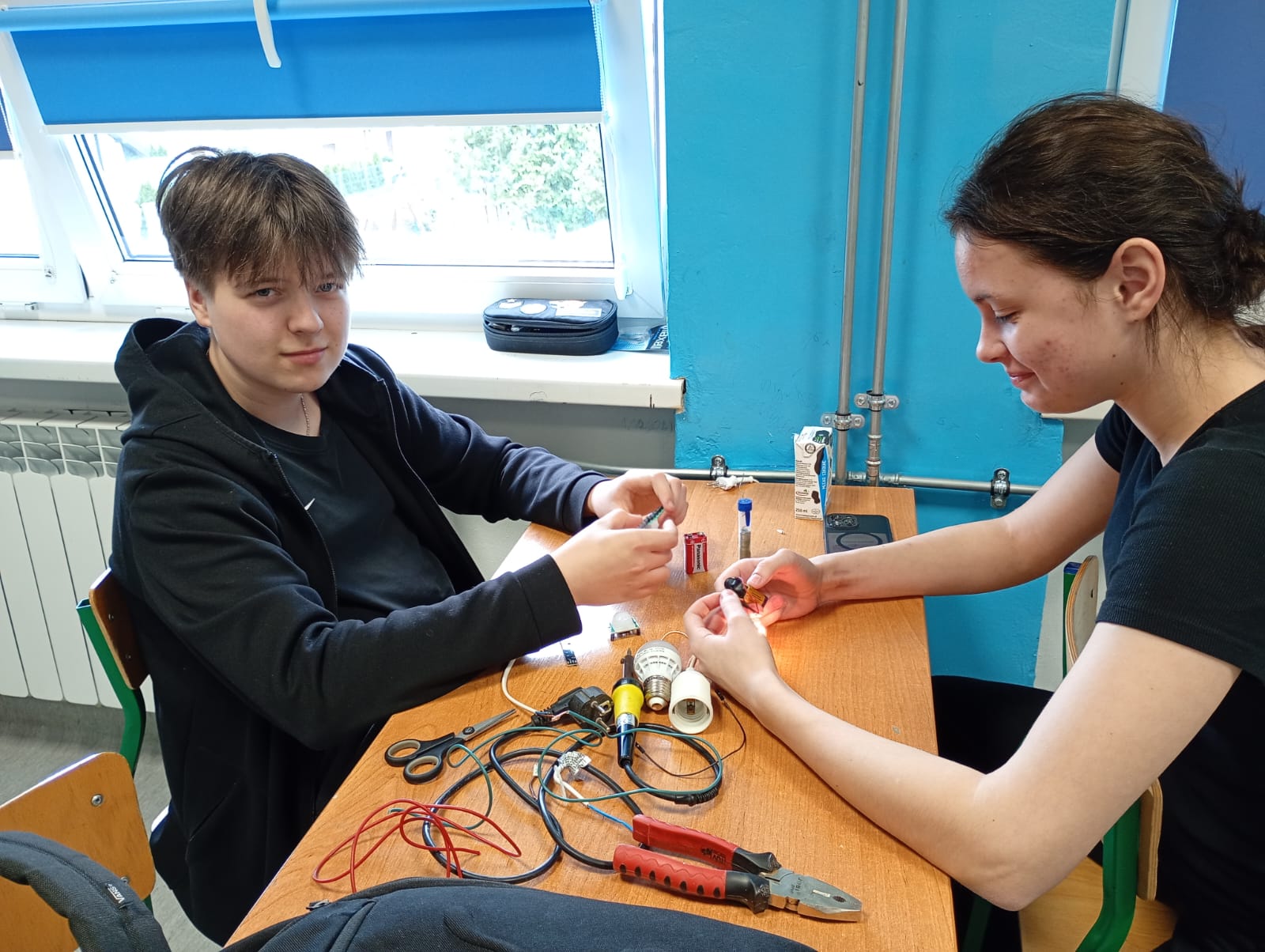 Na lekcji fizyki uczniowie zajmowali się budowaniem prostych obwodów elektrycznych. Samodzielnie łączyli elementy takie jak bateria, przewody, żarówka i wyłącznik, ucząc się, jak prawidłowo zamknąć obwód, aby popłynął prąd.