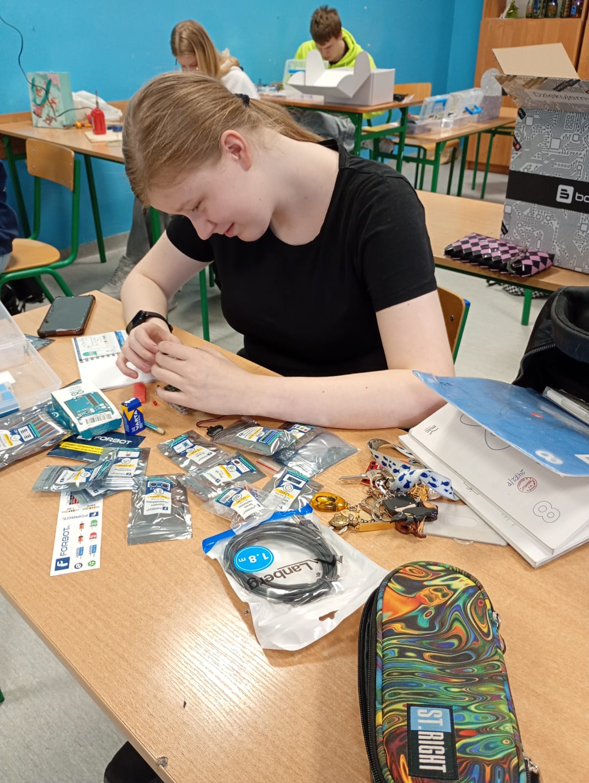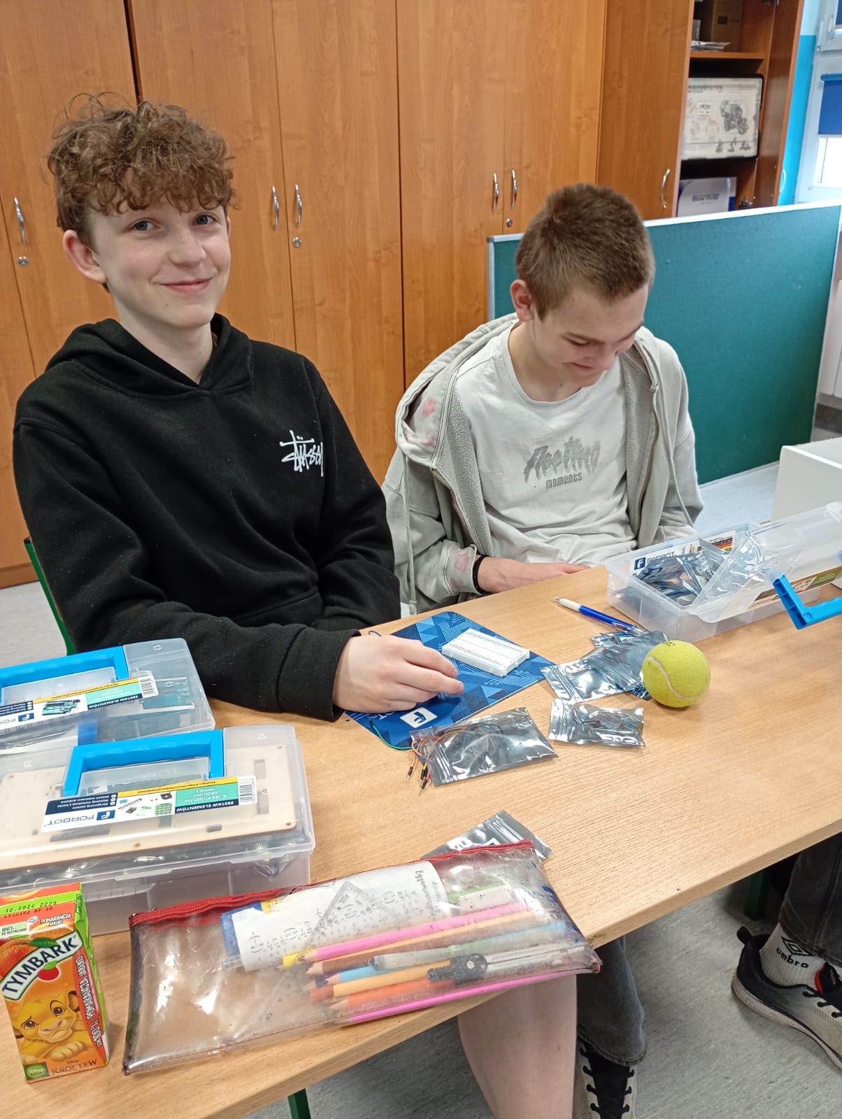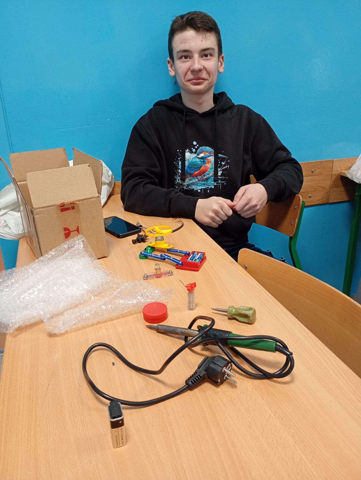 Na lekcji fizyki uczniowie zajmowali się budowaniem prostych obwodów elektrycznych. Samodzielnie łączyli elementy takie jak bateria, przewody, żarówka i wyłącznik, ucząc się, jak prawidłowo zamknąć obwód, aby popłynął prąd.
