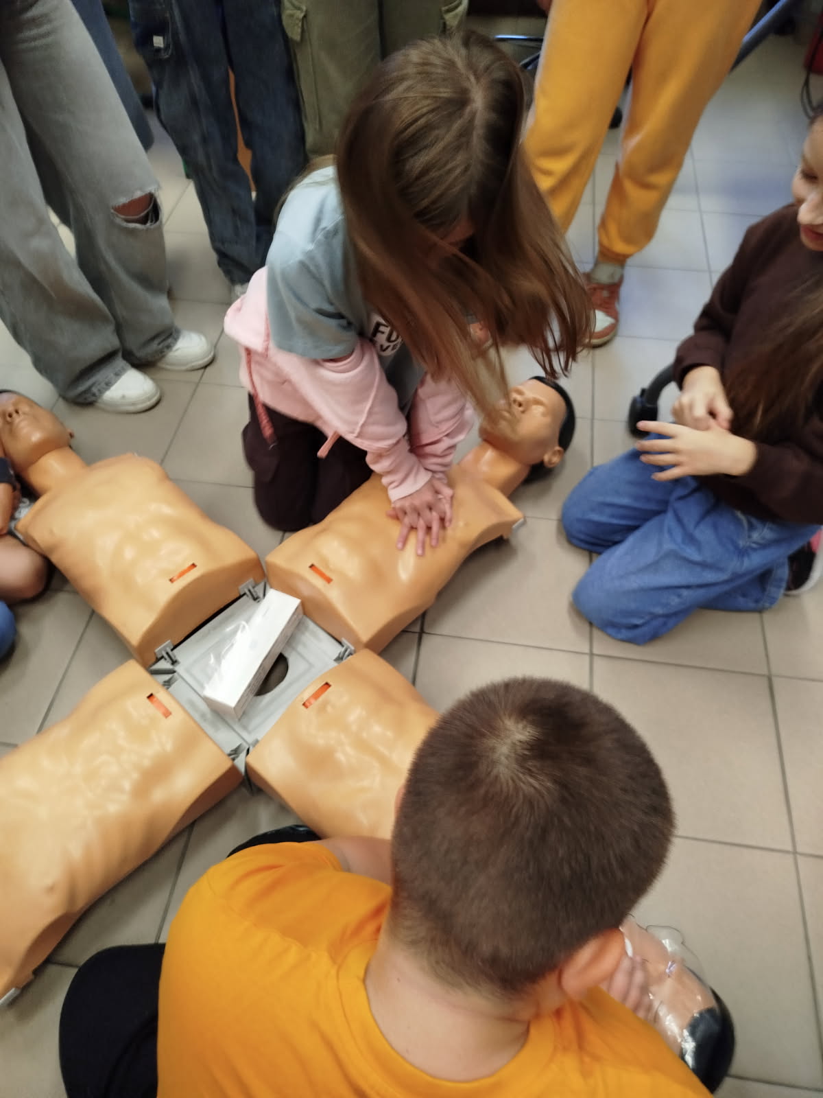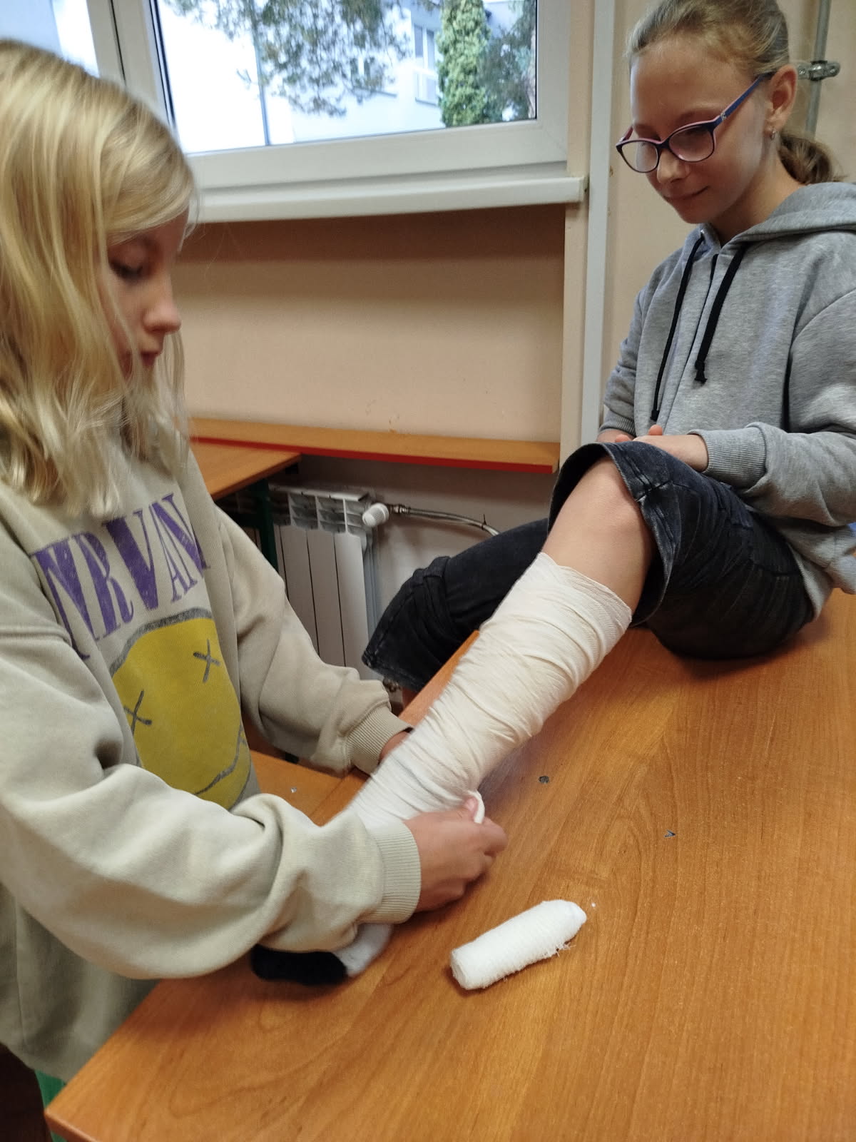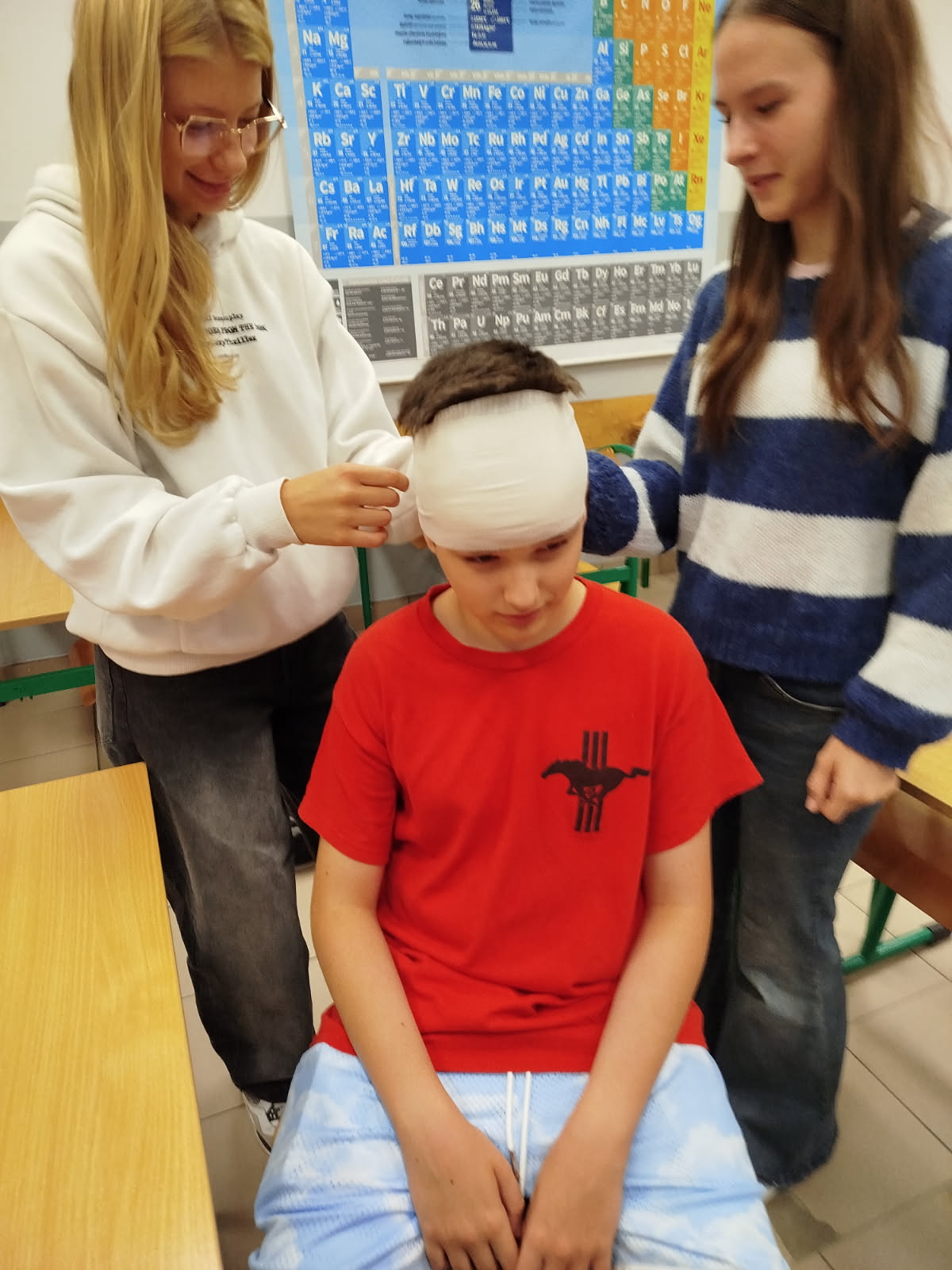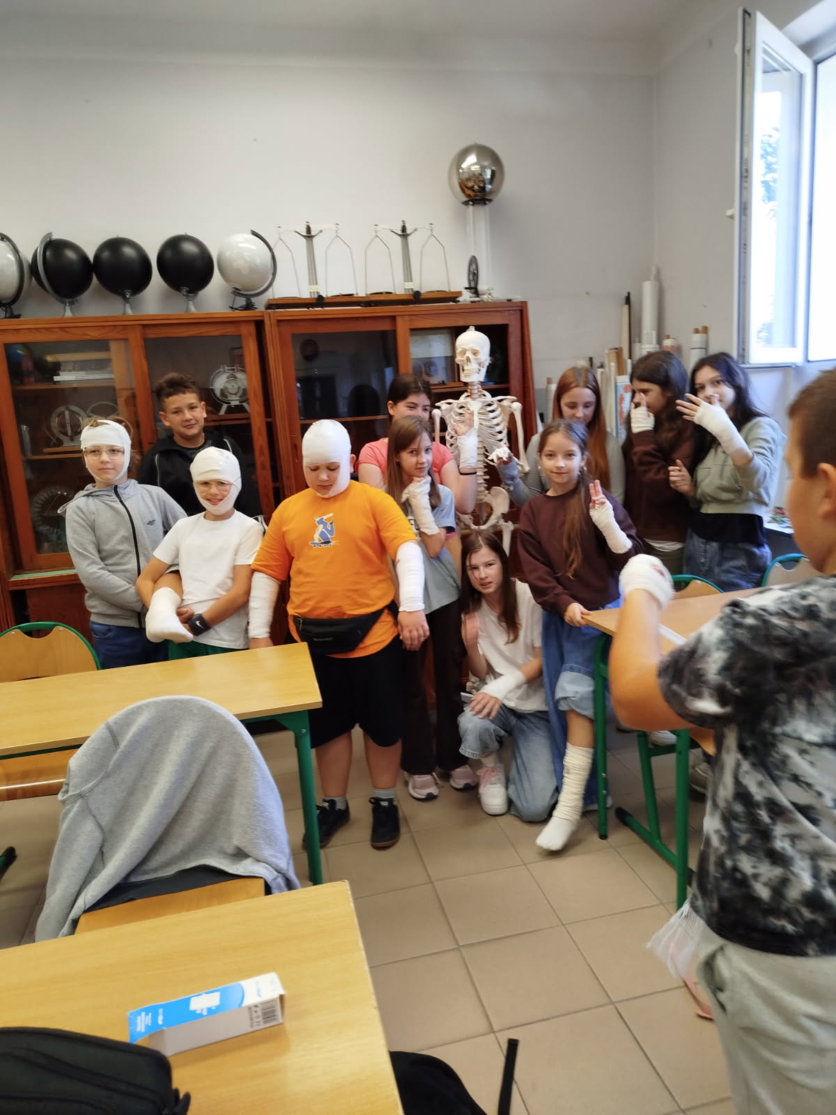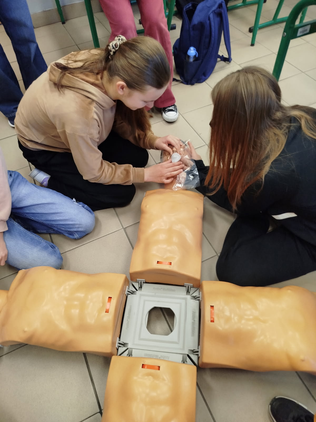 Uczniowie podczas zajęć z edukacji zdrowotnej z ogromnym zaangażowaniem uczyli się prawidłowo wykonywać resuscytację krążeniowo-oddechową. Za pomocą pulsoksymetru sprawdzali poziom nasycenia hemoglobiny tlenem oraz mierzyli tętno. Ćwiczyli także zakładanie opatrunków. Nauka przebiegała w atmosferze skupienia, ale i dobrej zabawy, co sprzyjało przyswajaniu tak ważnych umiejętności.