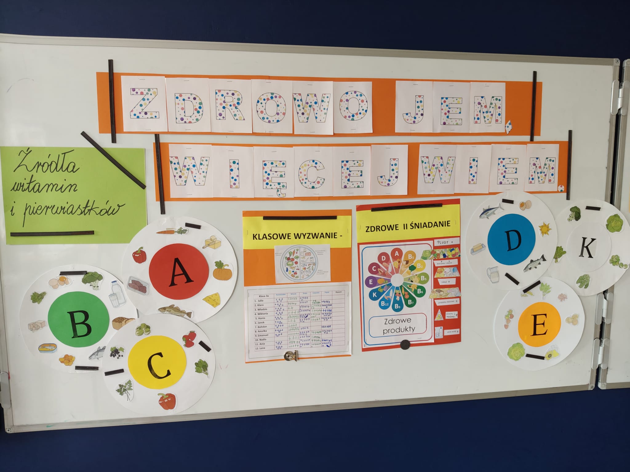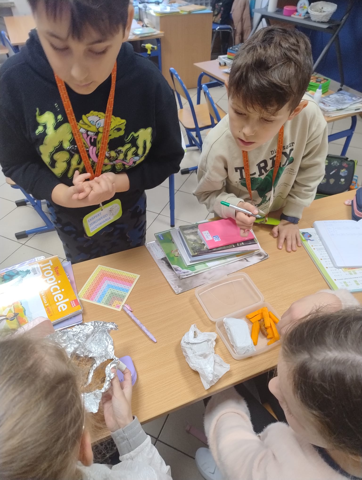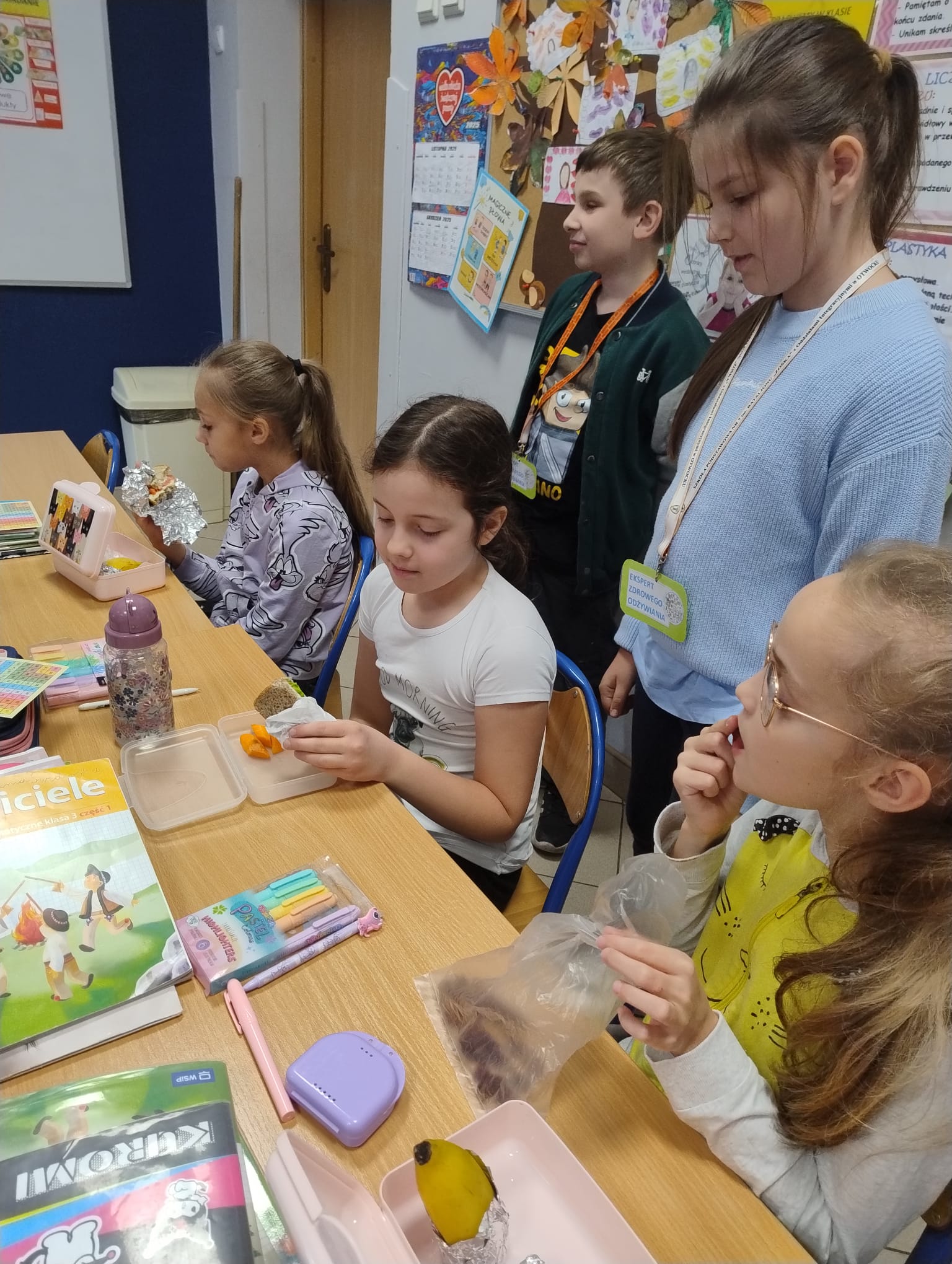 Później ruszyliśmy z klasowym wyzwaniem „Zdrowe II śniadanie”. Przez cały tydzień nasi „eksperci ds. żywienia” sprawdzali zawartość śniadaniówek swoich kolegów i koleżanek. Każdy zdrowy produkt — warzywa, owoce, pełnoziarniste pieczywo, nabiał czy orzechy — oznaczał plusik do zdobycia.