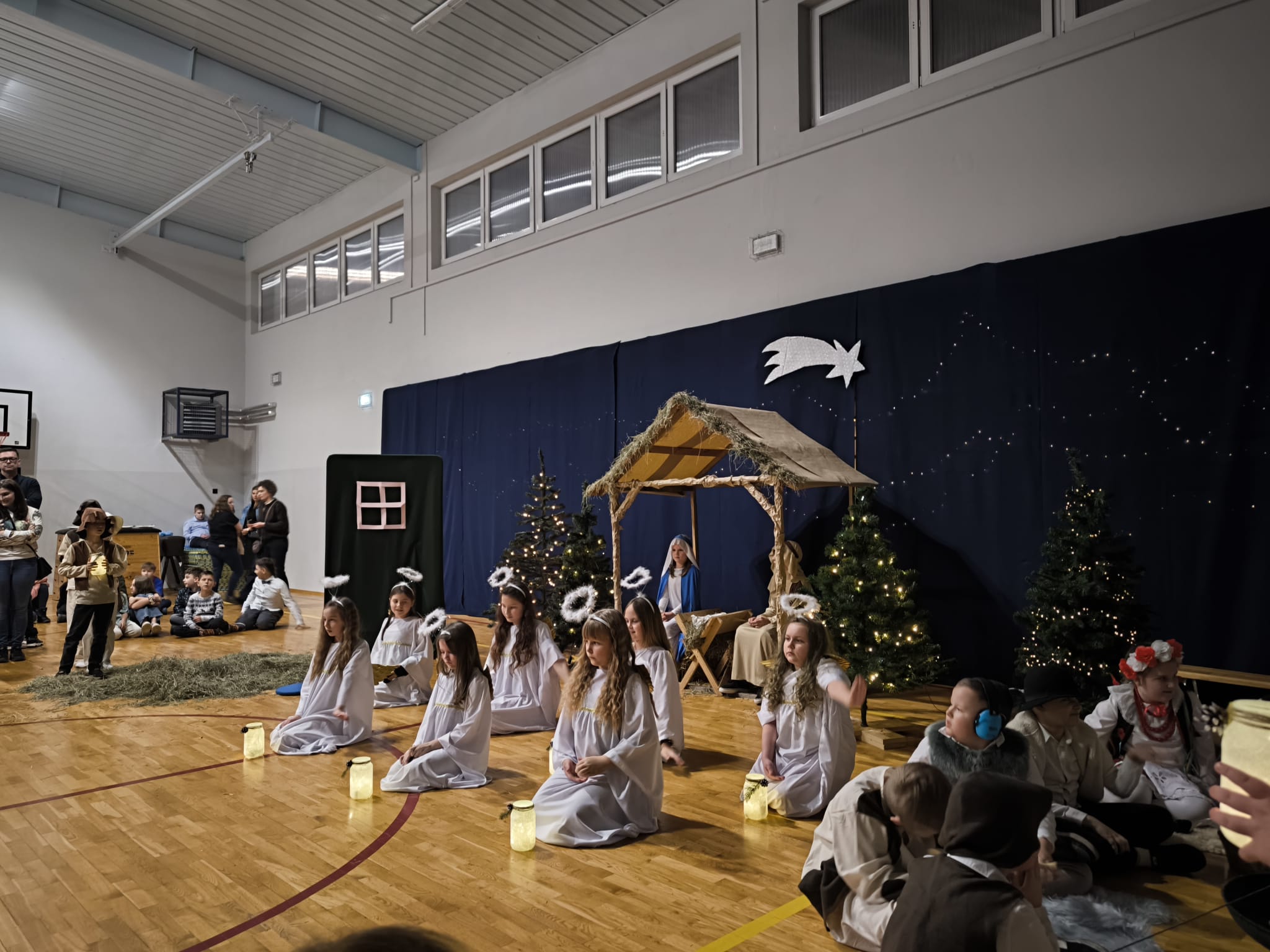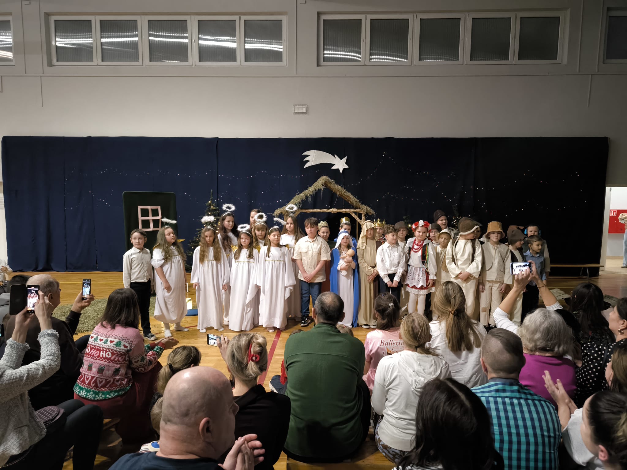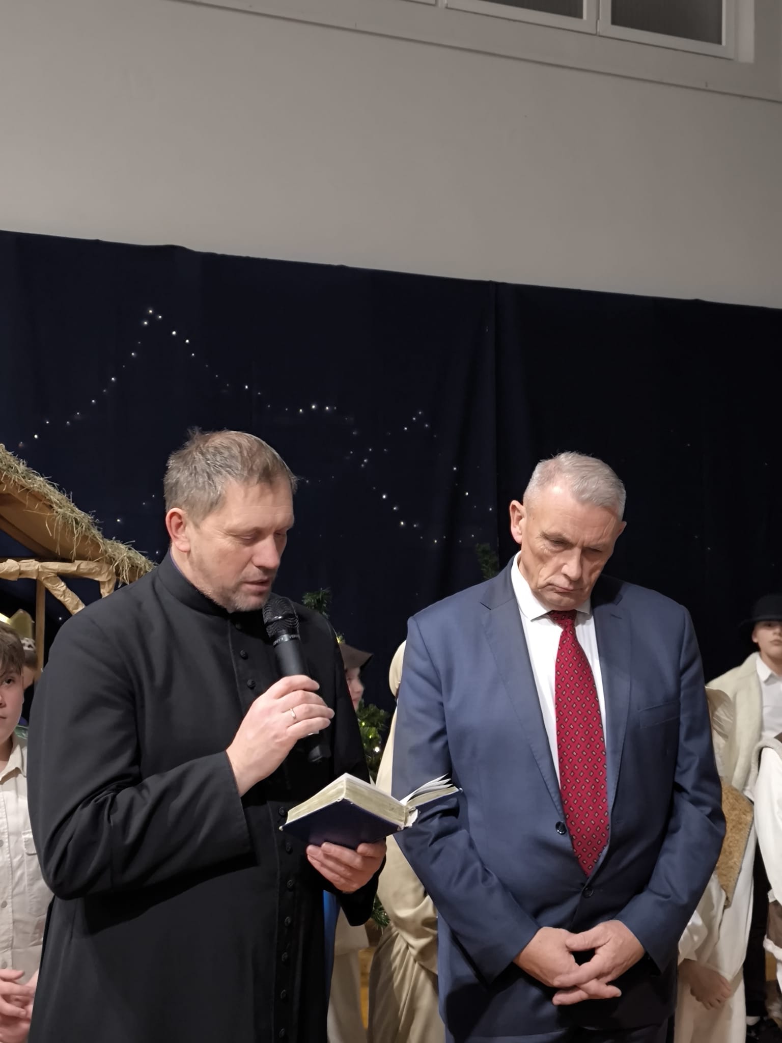 Spotkanie rozpoczęły piękne jasełka w wykonaniu klas 2a i 3b, które wprowadziły nas w bożonarodzeniowy nastrój. Następnie wysłuchaliśmy fragmentu Ewangelii odczytanej przez ks. Jacka Skoczylasa, a serdeczne życzenia świąteczne przekazali dyrektor szkoły oraz Rada Rodziców .